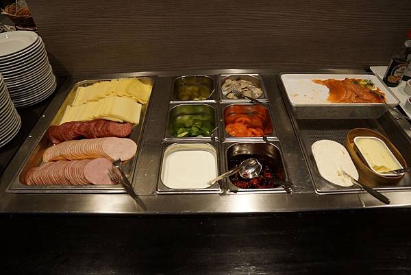 這邊是生冷的食物 , 有煙燻鮭魚、火腿、起司